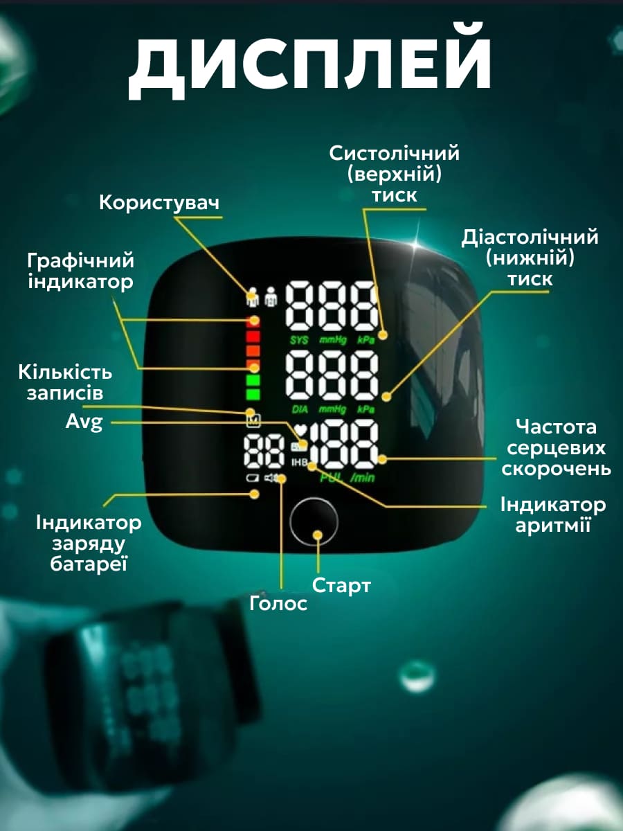 Додаткові опції - звукове сповіщення, виявлення аритмії, пам'ять вимірювань